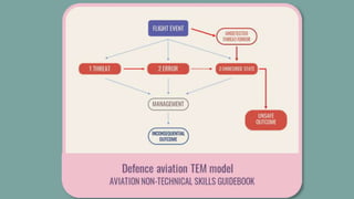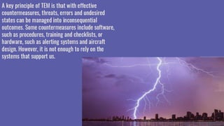 Threat and Error Management (TEM) is a framework that recognizes error as a normal part of human behavior. It focuses on anticipating, recognizing, and managing threats from outside influences as well as errors from inside influences to prevent unsafe outcomes. Threats are external influences outside a crew's control that could impact safety, while errors are actions or inactions by the crew that deviate from correct procedures. The goal is to recognize potential threats and errors and manage them before an undesired state occurs, which reduces safety margins but does not necessarily lead to an unsafe outcome. Key aspects of TEM include planning for potential threats, executing with good crew coordination and decision making, and reviewing operations to continually improve threat and error management.