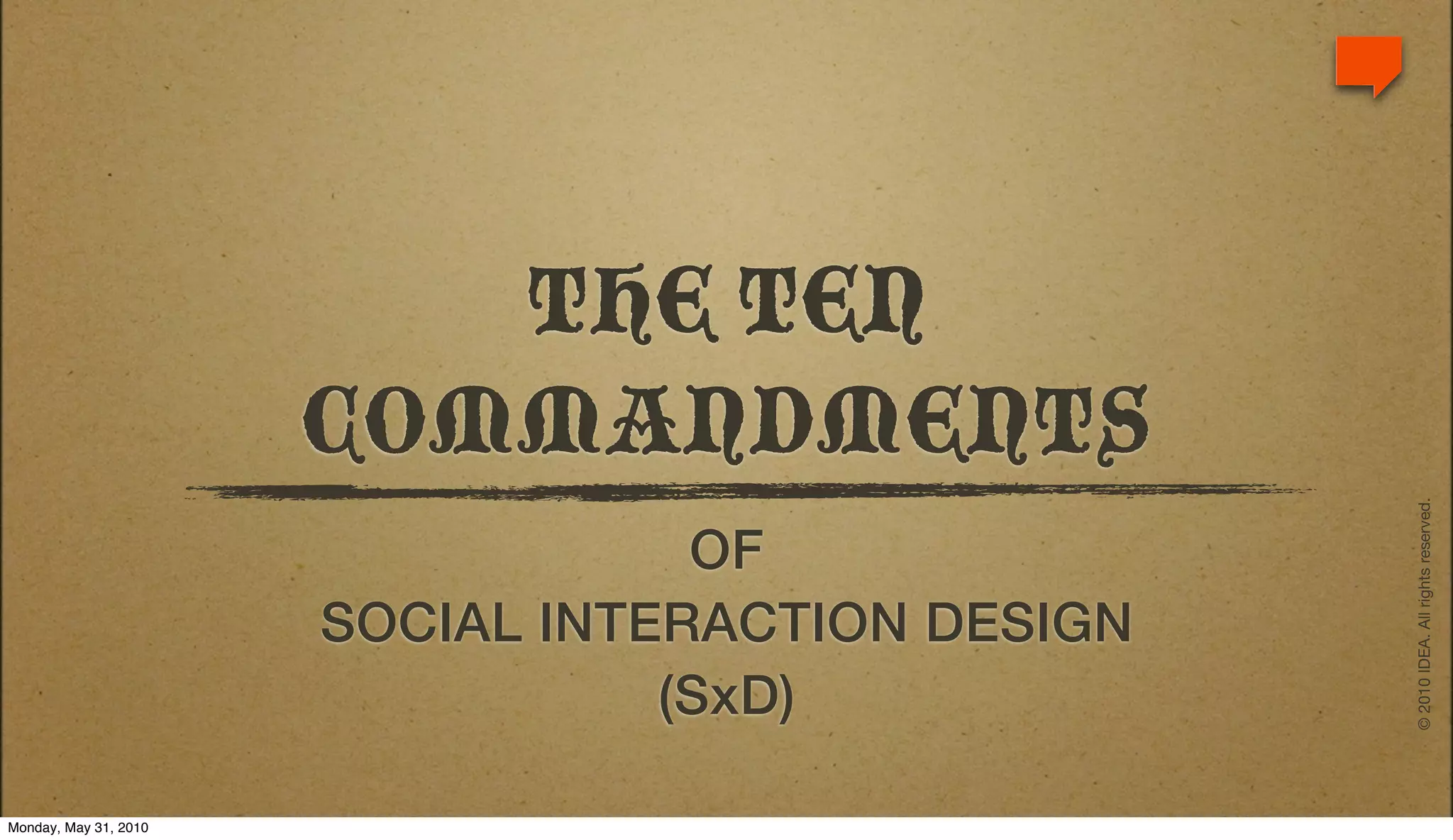 The document outlines the 'Ten Commandments of Social Interaction Design,' emphasizing the importance of understanding users, respecting privacy, and ensuring usability in digital platforms. Key principles include knowing user roles, providing clear communication, standardizing experiences, and making interactions engaging and enjoyable. The overall aim is to create positive and impactful user experiences while nurturing trust and engagement.