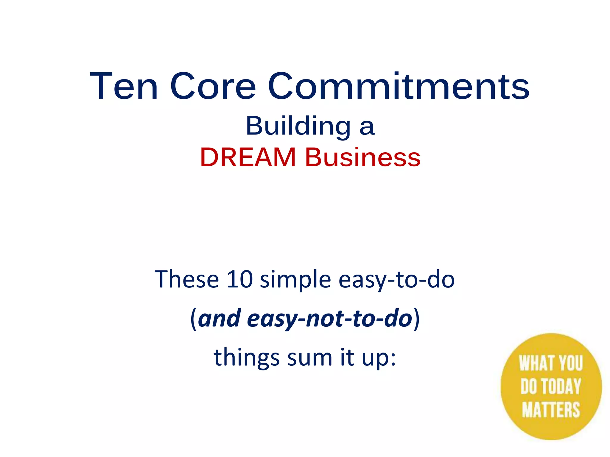 The document outlines 10 core commitments for building a successful dream business: 1) Get started right by reviewing the fast start system and setting a good example, 2) Fast start qualify within 30 days to set the pace, 3) Work the three-a-day system of sharing with three people daily, 4) Build through events by regularly attending meetings and trainings, 5) Attend all local and corporate trainings, 6) Attend regional events and share knowledge, 7) Attend all corporate conferences with your team, 8) Practice daily self-improvement through reading and audiobooks, 9) Find a workout partner to share goals with, and 10) Commit to investing a solid year to building the business consistently