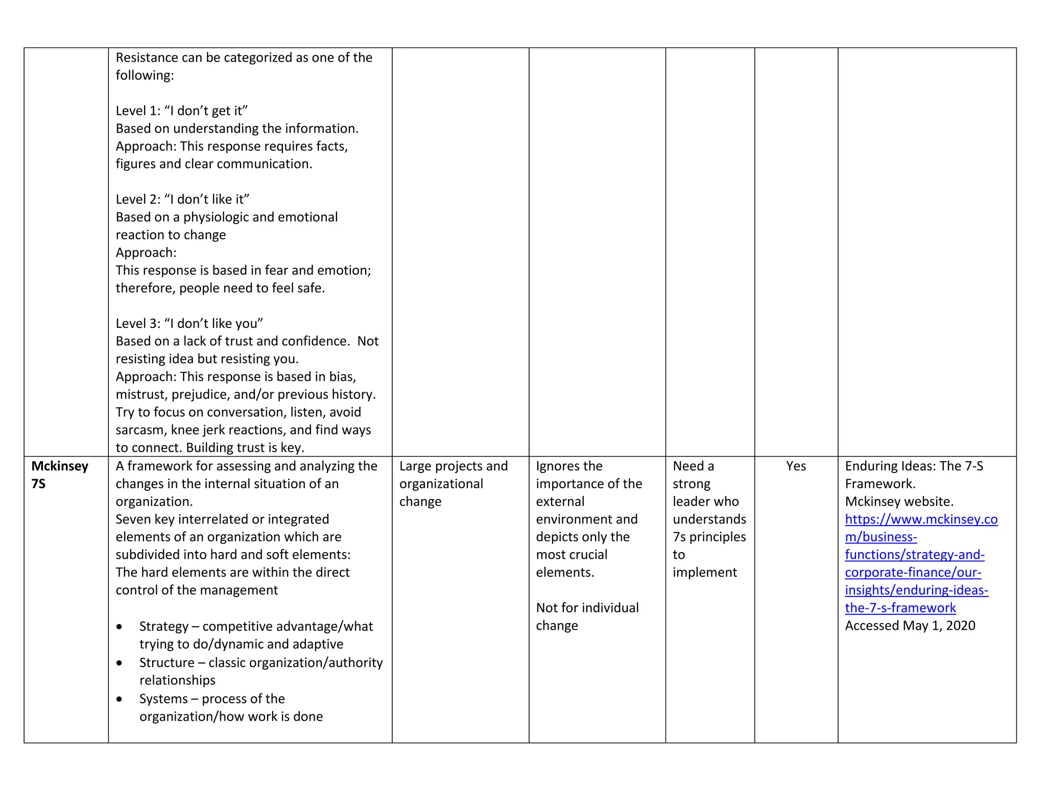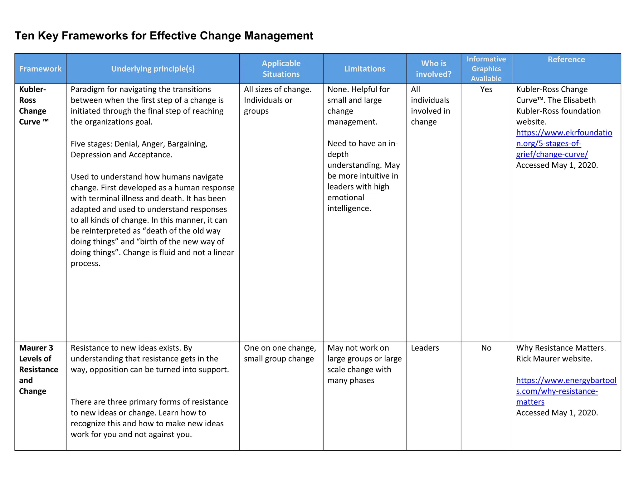 The document outlines ten key frameworks for effective change management, including the Kubler-Ross Change Curve, Maurer's levels of resistance, McKinsey 7S, and Kotter's 8-step model, each with specific principles, applicable situations, and limitations. It emphasizes the importance of understanding human responses to change, the dynamics of organizational structure, and strategies for overcoming resistance. Additionally, frameworks like the ADKAR model and Nudge Theory provide structured approaches to facilitate and sustain change in various contexts.