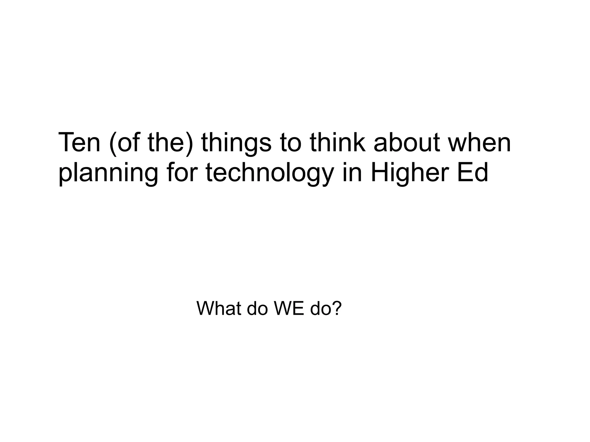 The document lists 10 things to consider when planning technology in higher education. It discusses balancing old and new technologies, whether to take a centralized or distributed approach, the risks of relying on money or free solutions, focusing on real problems rather than hypothetical solutions, choosing between open and closed systems, and whether to enforce or support technology use. It also mentions planning for faculty retirement and the post-digital future, as well as broadening one's knowledge base regarding educational technology options.