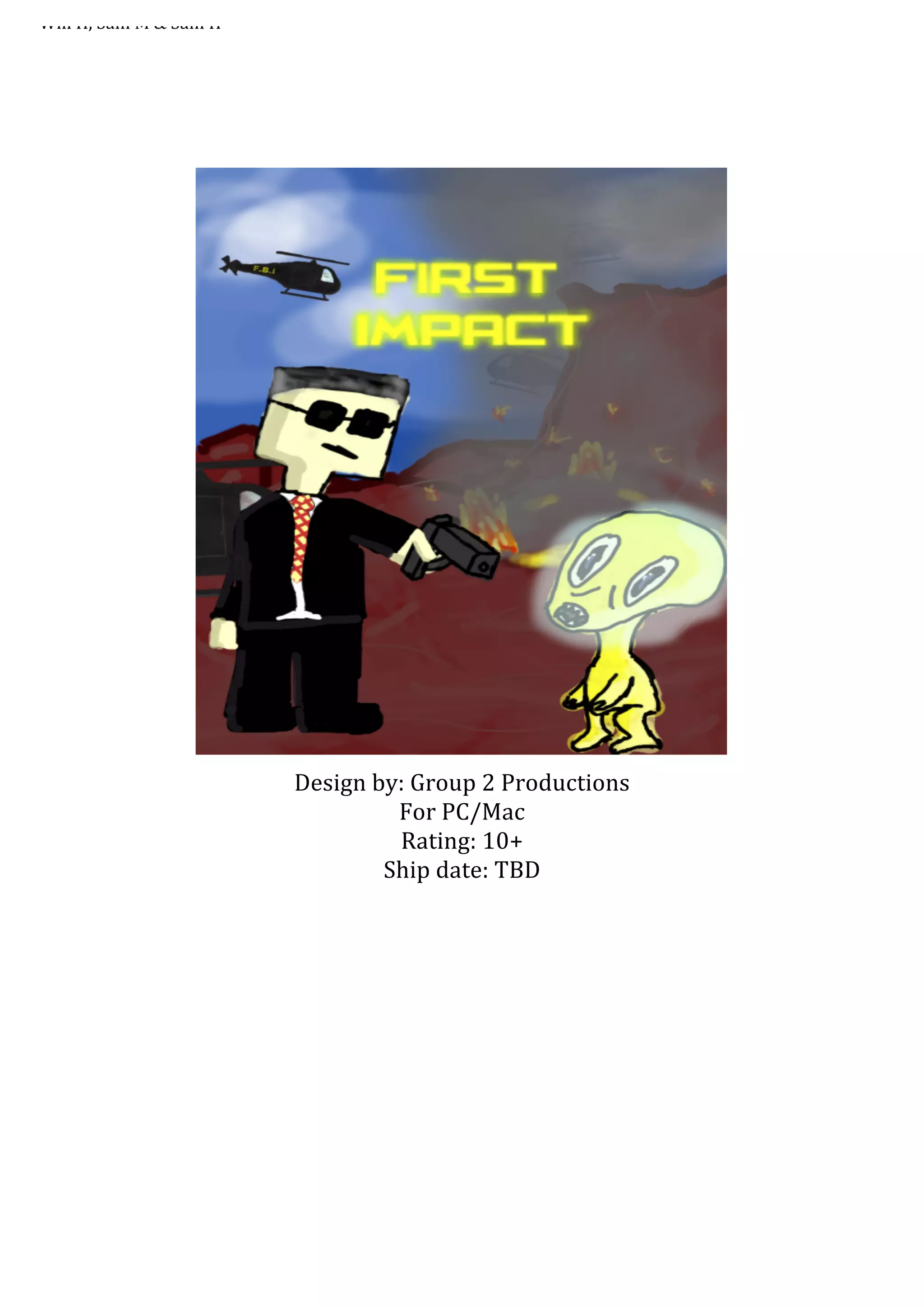 This document provides an overview of a proposed video game called "First Impact" to be designed by Group 2 Productions. The game would be a PC/Mac platform game consisting of 3 levels - Area 51, Earth, and Space - where the player controls an alien named Jeremy escaping capture and trying to make it back home. Gameplay involves puzzle-solving and outwitting guards to progress through each level while collecting items to increase the player's score.