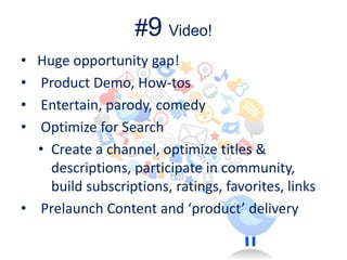 The document highlights ten essential aspects executives should understand about Facebook and social media marketing, focusing on the effectiveness of Facebook advertising compared to Google. It emphasizes using blogs, engaging with noteworthy content, leveraging video, and developing apps to enhance audience interaction. Additionally, it encourages executives to cascade content across multiple platforms to optimize reach and engagement.