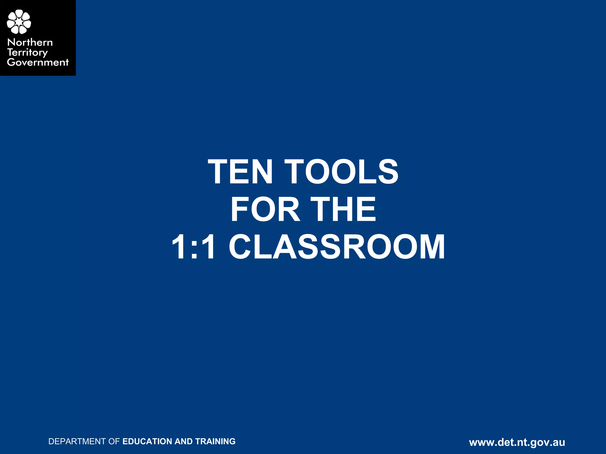 The document discusses 10 different digital tools that can be used in a 1:1 classroom environment, including Khan Academy, MathsOnline, MathsBuddy, Wallwisher, and additional tools like Padlet and Sway. It provides descriptions of each tool's purpose and capabilities, such as interactive lessons, practice exercises, progress tracking, and facilitating collaboration and discussion. The document encourages teachers to try using these tools to flip their classroom, engage students, and promote independent and personalized learning.