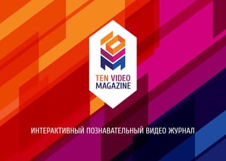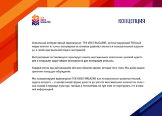В документе представлена концепция интерактивного видеожурнала Ten Video Magazine, который сочетает развлекательный и познавательный контент, вовлекающий целевую аудиторию. Журнал охватывает разнообразные рубрики, такие как мода, спорт, путешествия и здоровье, предлагая зрителям уникальный формат подачи информации и возможности для участия в конкурсах. Также документ содержит информацию о рекламных возможностях и партнерской программе для образовательного и развлекательного контента в заведениях.