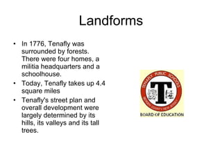 Tenafly, New Jersey has changed significantly since its founding in 1776. Originally surrounded by forests with only four homes, a militia headquarters, and schoolhouse, it now covers 4.4 square miles with over 13,000 residents. Several landmarks illustrate its development, including the 1874 railroad station that became the downtown center, and the Clinton House built in the late 1800s to accommodate train passengers. Washington Street has been the business district since the early 1900s, and the Roosevelt Monument in a donated 28 acre park commemorates conservation.