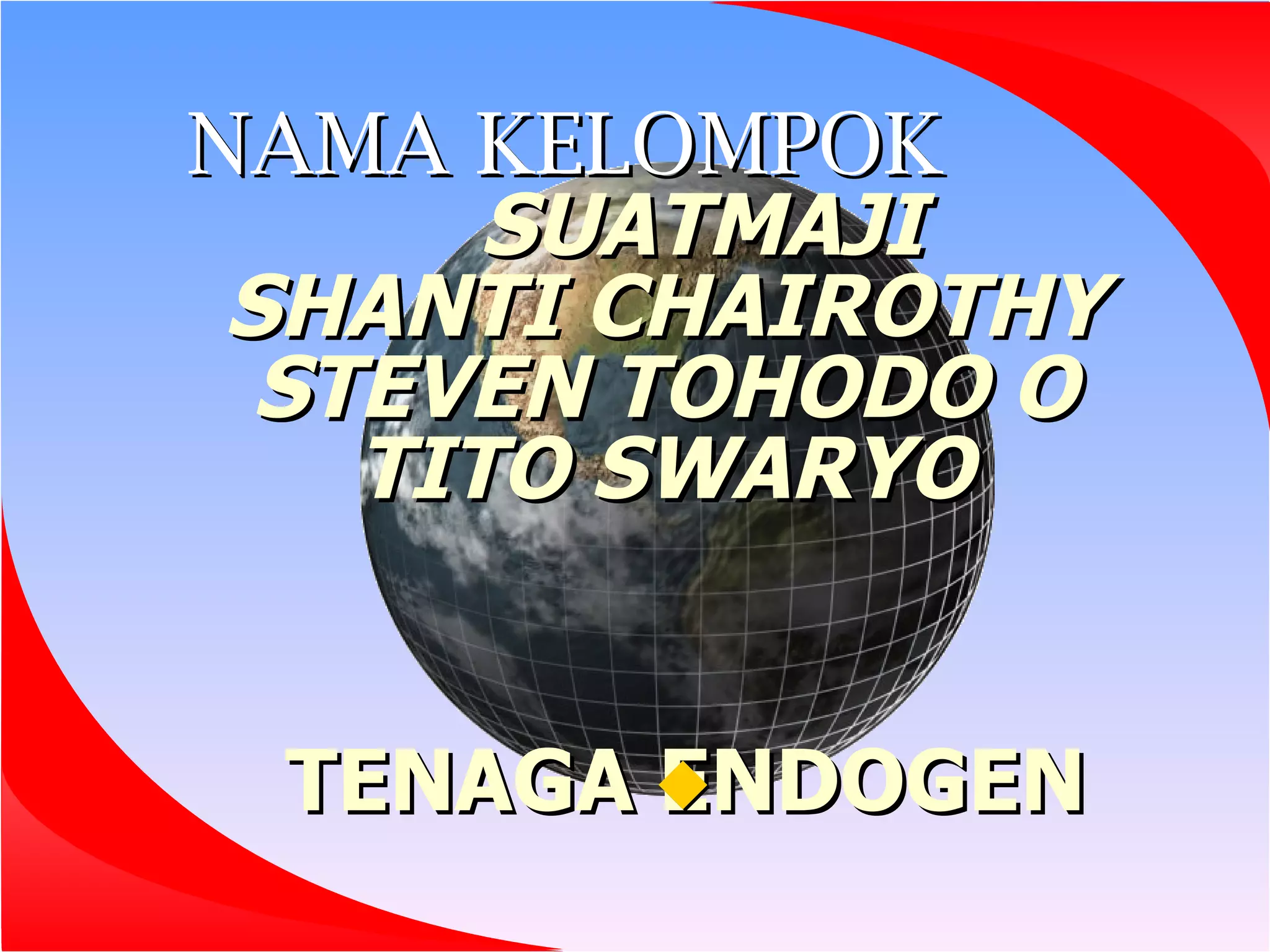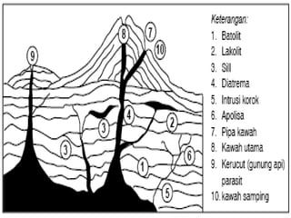 Dokumen tersebut memberikan penjelasan mengenai konsep tenaga endogen dan aktivitas vulkanik yang terjadi di dalam bumi. Tenaga endogen berasal dari dalam bumi yang menyebabkan pergerakan kerak bumi akibat tekanan magma di lapisan astenosfer. Aktivitas ini dapat menimbulkan gunung berapi, gempa bumi, dan perubahan bentuk permukaan bumi seperti pegunungan dan lembah.