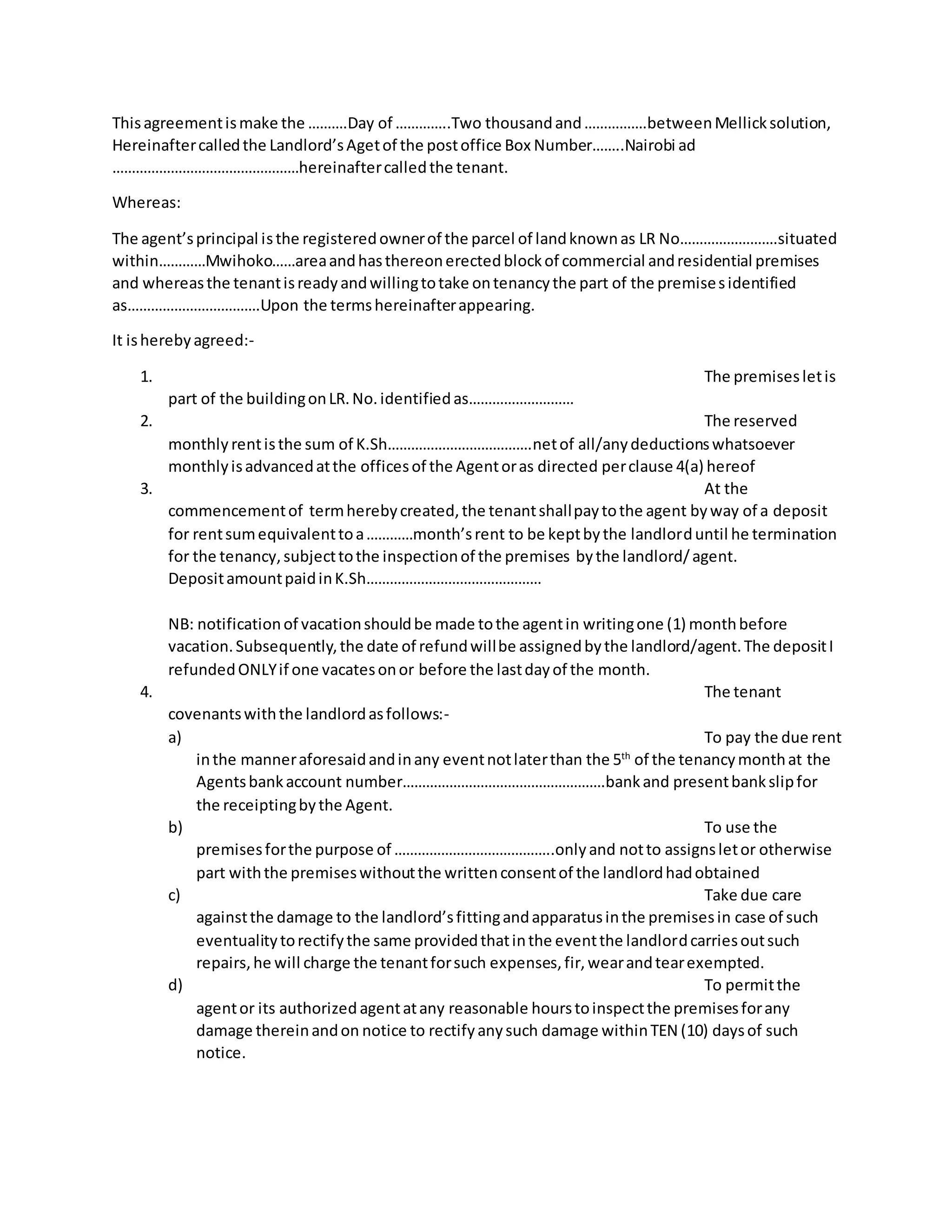 1. The tenant agrees to rent part of a commercial/residential building identified as [blank] for an agreed monthly rent of [blank] payable by the 5th of each month.