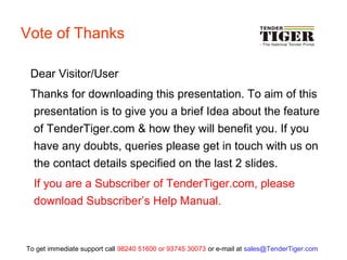 This user manual provides an overview of the features available to free and paid users on the TenderTiger website. As a free user, one can view certain free tenders, tender briefs, and sections. Paid subscribers gain access to tender details, documents, alerts and a customized dashboard. The document describes the tender search tools, various subscription plans for individuals and corporates, and services offered like hosting tenders, advertising, and eProcurement solutions. Contact information is provided for sales support.
