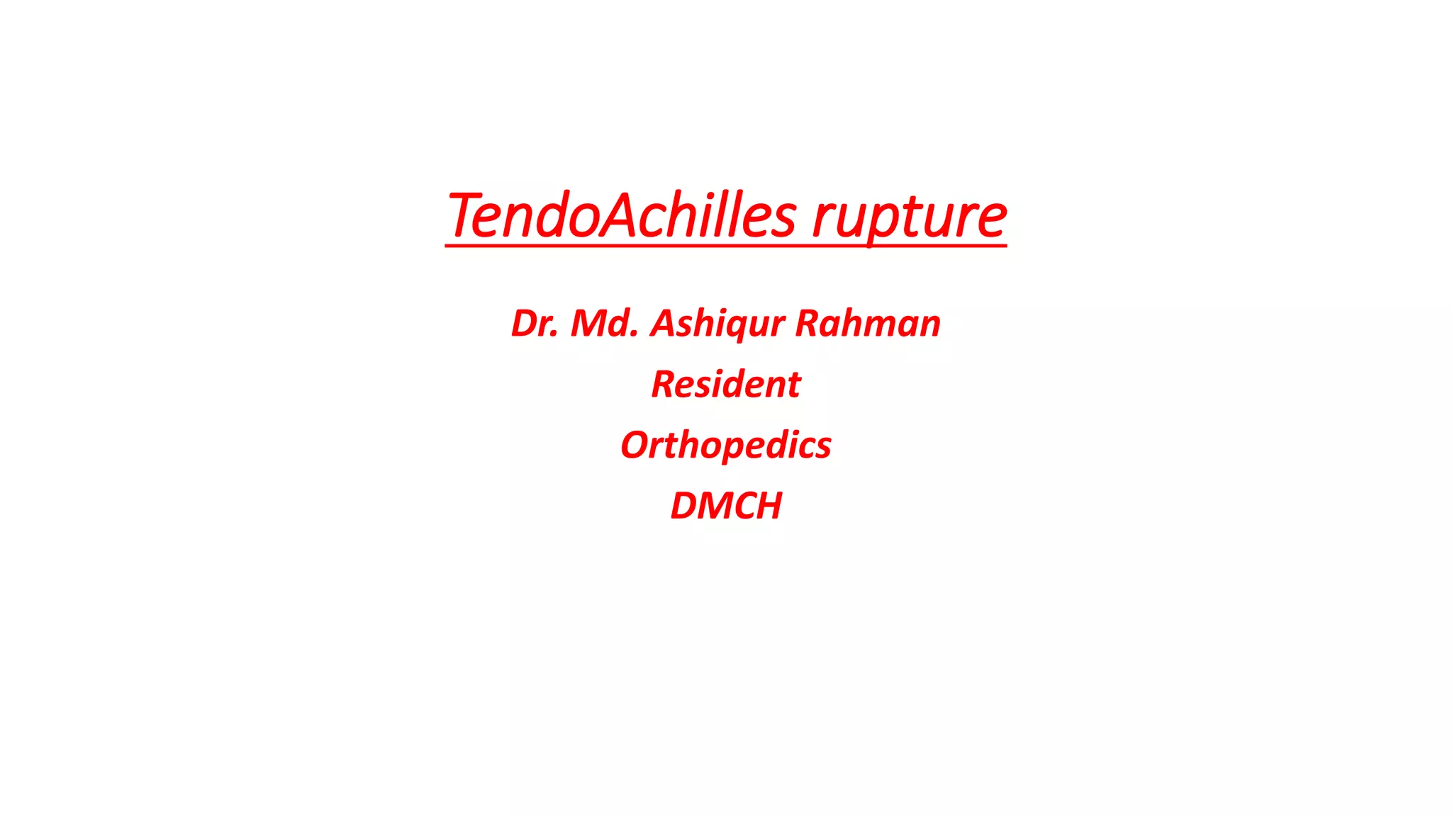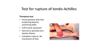 The document provides an overview of tendoachilles injuries, including classification into ruptures and tears, their mechanisms, clinical features, diagnosis, and treatment methods. It outlines examination techniques, surgical repair procedures for both fresh and neglected ruptures, and post-operative management strategies. Key examinations and surgical techniques are detailed, along with indications for each method of treatment.
