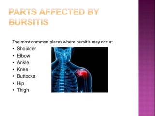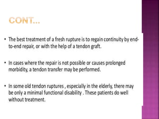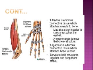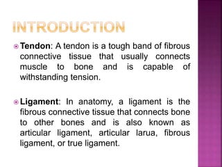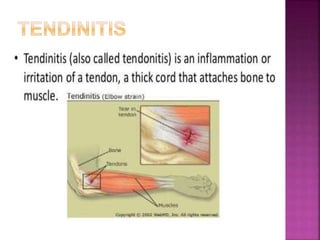 2) Common tendon and ligament injuries include strains, tendinitis, tendinosis, subluxation, ruptures, and sprains. Symptoms include pain, swelling, stiffness, and loss of motion.