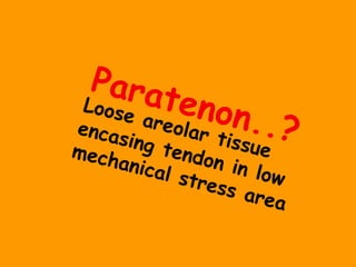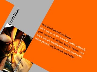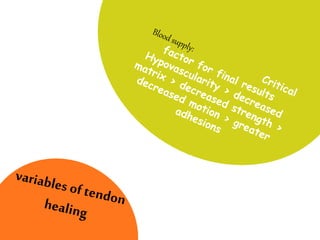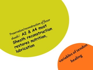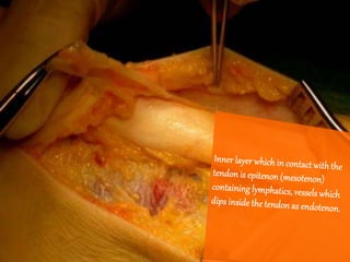 This document discusses tendon healing and repair techniques. It covers the histology of tendons, the tendon healing process, and various techniques for tendon repair including suturing methods and tendon grafting. Key points include that both intrinsic and extrinsic healing contribute to tendon repair, and techniques like controlled motion help promote healing while preventing adhesions. Suturing methods like the Kessler and cruciate repairs are discussed and compared. Tendon grafting indications and requirements are also outlined.