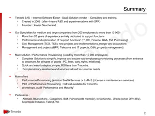 TENEDO offers a SaaS solution called Performance Provisioning that streamlines the provisioning processes for allocating resources and services to employees from hiring to departure, with the goal of improving security, reducing costs, and fostering collaboration across departments. Performance Provisioning models an organization's internal services like IT, HR, finance as a "Business Mall Center" to simplify managing the lifecycle of employees and contractors. The solution aims to replace outdated systems with an easy to deploy web application for systematically provisioning all types of resources.