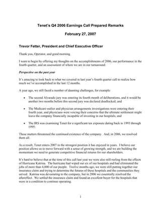 The document is Trevor Fetter, President and CEO of Tenet Healthcare's, prepared remarks from an earnings call on February 27, 2007. Fetter discusses Tenet's accomplishments in 2006 including resolving legal issues, settling insurance claims from Hurricane Katrina, and appointing new executives. He provides an outlook for 2007 of $700-800 million in EBITDA and discusses strategies like targeted growth initiatives and increased capital expenditures to drive volume growth. Stephen Newman, Chief Operating Officer, then discusses executing on these strategies including improving outpatient services to further increase volumes and performance.