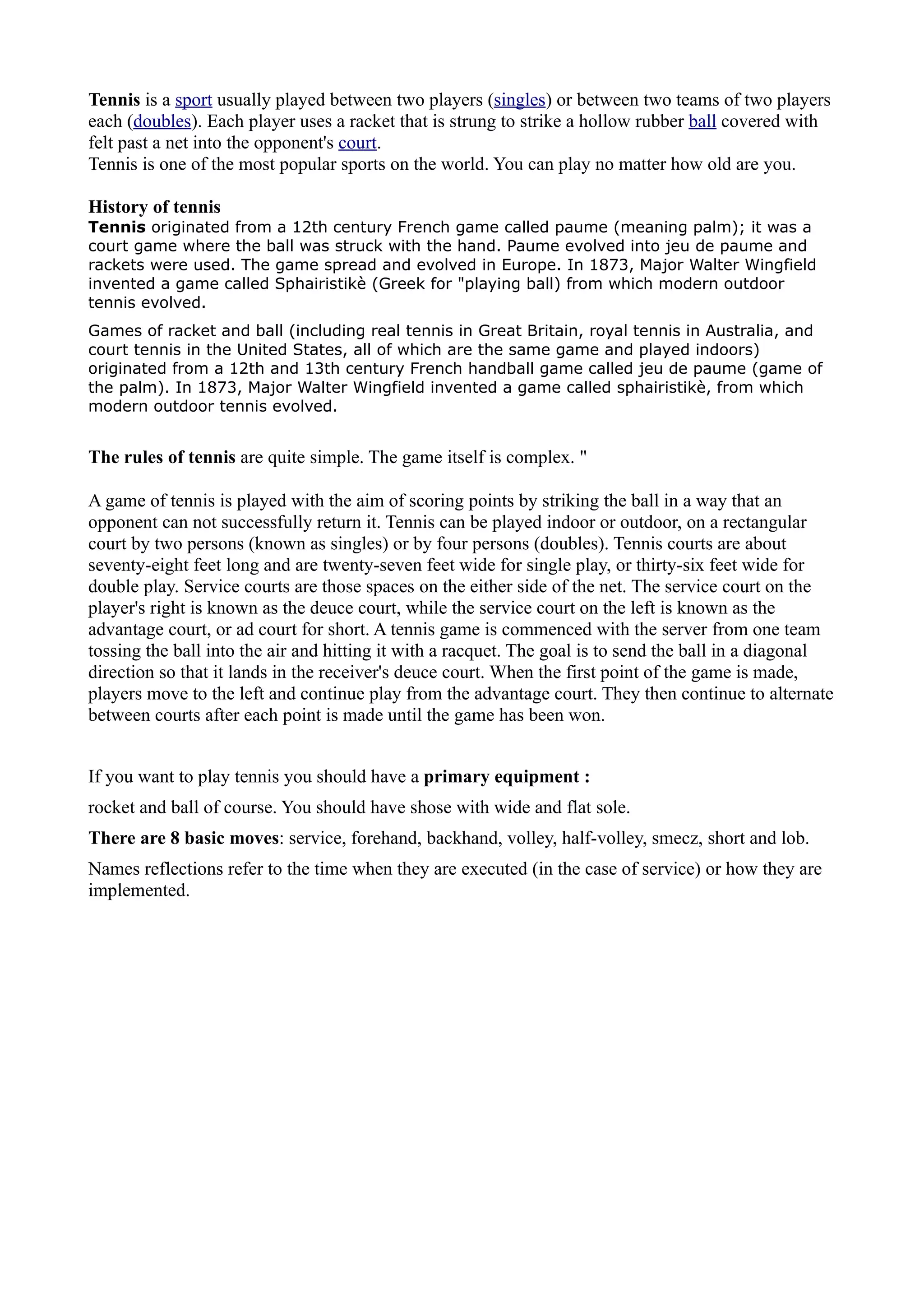 Tennis originated in 12th century France as a handball game called paume that evolved to use rackets. Major Walter Wingfield later invented the modern outdoor game of tennis in 1873. Tennis is played between two singles players or two doubles teams using rackets and a ball on a large outdoor or indoor court, with the aim of scoring points by hitting the ball past the opponent without it being returned. The basic equipment needed is a racket and ball, with tennis shoes recommended, and there are eight fundamental shot techniques used in play.