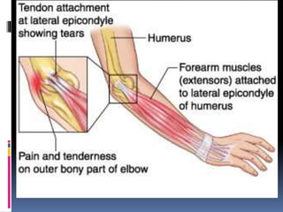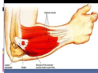 Tennis elbow, or lateral epicondylitis, is an inflammation of the tendons that connect the forearm muscles to the outside of the elbow. It is commonly caused by repetitive stress activities like tennis, other sports, or occupations involving gripping motions. The most common type is lateral tennis elbow, which involves the tendons on the outside of the elbow. Symptoms include pain and tenderness on the lateral side of the elbow that is worsened by activities. Conservative treatments include rest, physiotherapy, bracing, anti-inflammatory drugs, and steroid injections. Surgery is an option for cases that do not improve with conservative care. Prognosis is generally good with initial treatment but relapses are common.