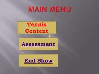 The document defines common tennis terms like love (zero points), singles (one on one), doubles (two on two teams), deuce (40-40 tie), and scoring sequences. It also explains different shots like serves, lobs to pass over an opponent, and drop shots that bounce low. Game and set rules are also outlined along with a video on proper serve grip technique.