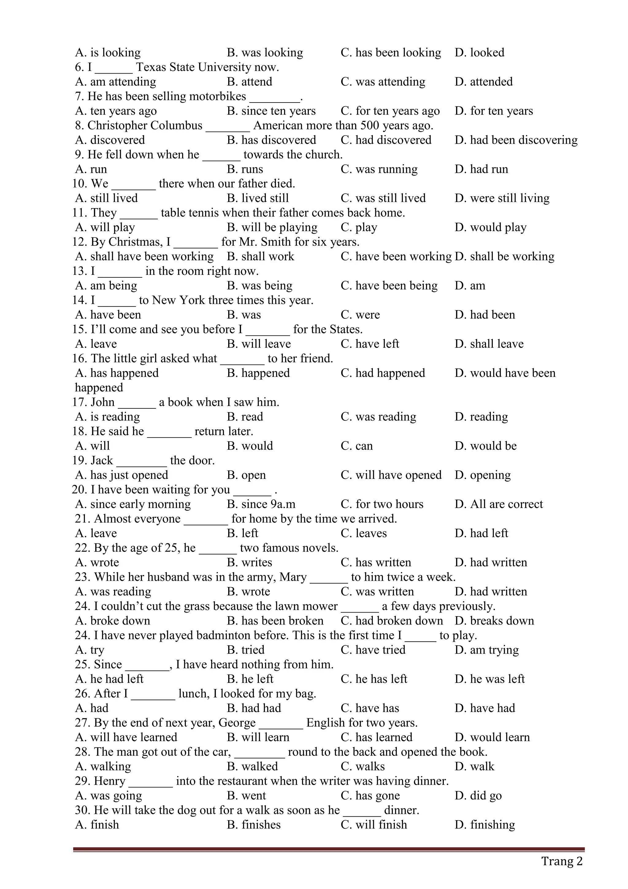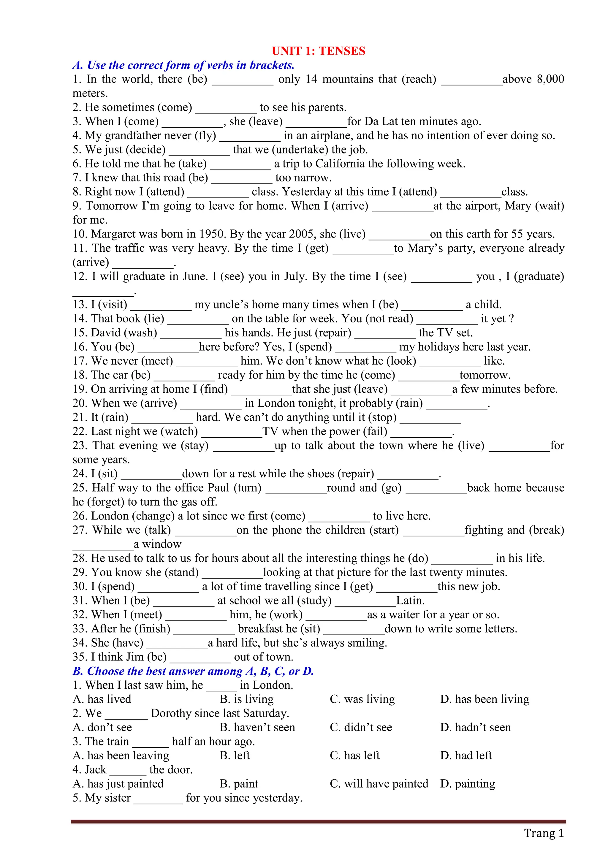 This document provides a grammar exercise on verb tenses. It contains 31 multiple choice questions and 29 fill-in-the-blank questions testing the use of verbs in different tenses. The questions cover a variety of tenses including simple present, present continuous, simple past, past continuous, present perfect, past perfect, future, and future continuous.