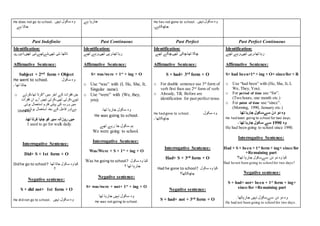This document summarizes the English tenses. It provides the identification, affirmative sentences, interrogative sentences, and negative sentences for each tense including present indefinite, present continuous, present perfect, present perfect continuous, past indefinite, past continuous, past perfect, past perfect continuous, future indefinite and future continuous tenses. For each tense, it specifies which forms of verbs to use for different subjects (I, he, she, it, we, they, you) and gives examples of sentences in each tense.