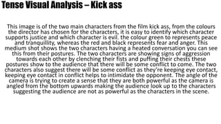 The image shows the two main characters from the film Kick Ass having a heated conversation in a medium shot. The director uses green to represent the just character and red and black to represent the evil character. Both characters are showing signs of aggression by clenching fists, puffing chests, and maintaining eye contact, suggesting an upcoming conflict. The camera angle looks up at the characters, making them seem powerful over the audience.