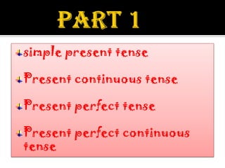 The document discusses the different tenses in English including the simple present, present continuous, present perfect, and present perfect continuous tenses. It provides examples of how and when to use each tense along with explanations of their grammatical rules. It also includes links to additional online exercises and resources for practicing these tenses.