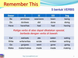 The document provides an overview of English verbs, their forms (I, II, III), and examples of correct and incorrect usage in sentences. It outlines various tenses including present, past, and future, along with continuous and perfect forms. Additionally, it includes information about modals and their corresponding grammatical structures for different tenses.