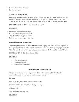The document discusses the different verb tenses in English, including present, past, and future tenses. There are three main tenses - present, past, and future. Within each main tense there are four forms - simple, continuous, perfect, and perfect continuous. Each tense form has a specific formula and usage to indicate the time or progression of an action. Examples are provided to illustrate how to conjugate verbs in the affirmative, negative, and interrogative forms of each tense.