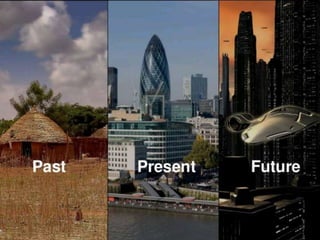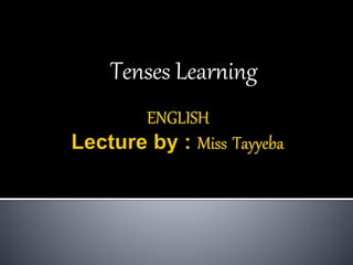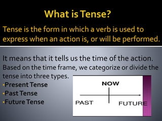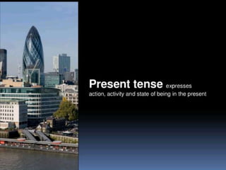 The document discusses the three main tenses in English: present, past, and future. It focuses on explaining the present tense in more detail, noting that it expresses current or habitual actions and can be simple, continuous, perfect, or perfect continuous. Examples are given of affirmative, negative, and interrogative sentences using the present tense. Key details covered include the use of the first form of the verb and adding -s or -es depending on the subject.