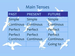 - Main tenses are simple, continuous, perfect, and perfect continuous in past, present, and future.