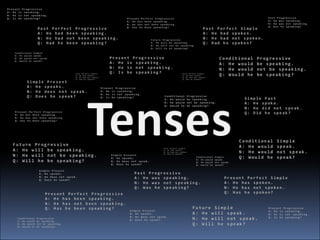 - Future tense which expresses future actions using forms like simple future, future continuous, future perfect, etc.