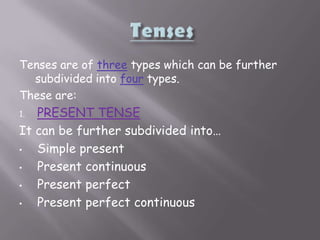 The document discusses the different types of tenses in English, including present, past, and future tenses. It notes that each tense can be further divided into simple, continuous, perfect, and perfect continuous forms. For each tense and form, the document provides examples of usage and signal words. The types of tenses are used to indicate actions that occur once, over a period of time, before or after other actions, and at different points in the past, present or future.