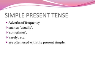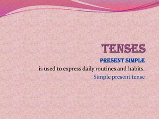 The document discusses various tenses in English, including the present simple tense, present continuous tense, and present perfect tense. The present simple tense is used to express daily routines and habits, often with adverbs of frequency. The present continuous tense refers to actions happening at the moment of speaking. The present perfect tense refers to an action that occurred at an unspecified time before now and is used to discuss experience, change over time, accomplishments, uncompleted actions, and multiple actions at different times. Time expressions can further specify the period being referred to.