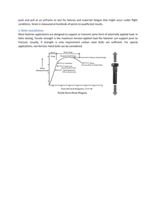 Tensile testing is used to determine the strength and ductility of materials. A specimen is placed in grips and pulled apart under increasing tensile force while measuring elongation. The resulting stress-strain curve provides properties like yield strength, tensile strength, and Young's modulus. Tensile tests are important for engineering design and quality control by ensuring materials can withstand expected loads and comparing new materials. Common applications include testing aircraft components, bolts, and other loaded structures.