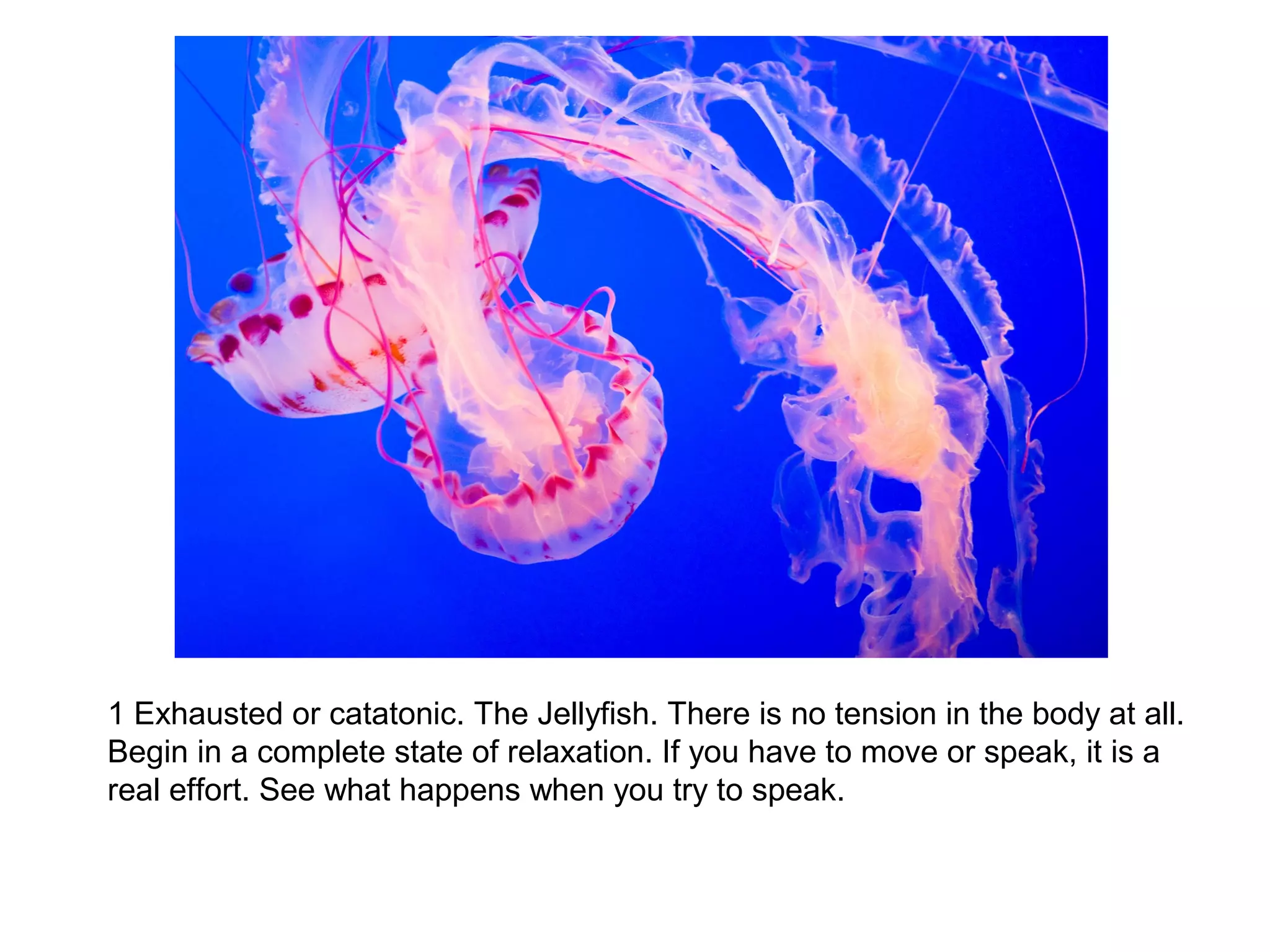 The document describes 7 levels of tension in the body from complete relaxation to tragedy. Level 1 is complete relaxation with no tension in the body. Level 2 is laid back with everything said in a cool, relaxed manner. Level 3 is a neutral state of tension, being totally present and aware. Level 4 is an alert, curious state like Mr. Bean. Level 5 is suspense where a crisis is about to happen, with tension concentrated between the eyes. Level 6 is passionate like opera, where the tension has exploded out of the body. Level 7 is tragic, where the body is solid tension and cannot move.