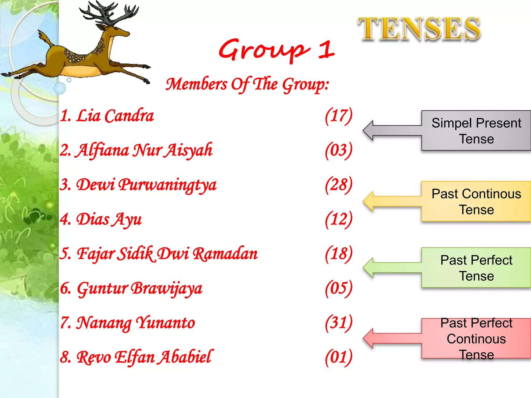Dokumen ini membahas berbagai jenis tense dalam bahasa Inggris, termasuk simple present, present continuous, present perfect, dan past perfect continuous. Setiap tense dijelaskan dengan rumus dan contoh kalimat untuk membantu pemahaman pengguna. Tense digunakan untuk menyatakan fakta, kebiasaan, aksi yang sedang berlangsung, dan situasi yang berhubungan dengan waktu tertentu.