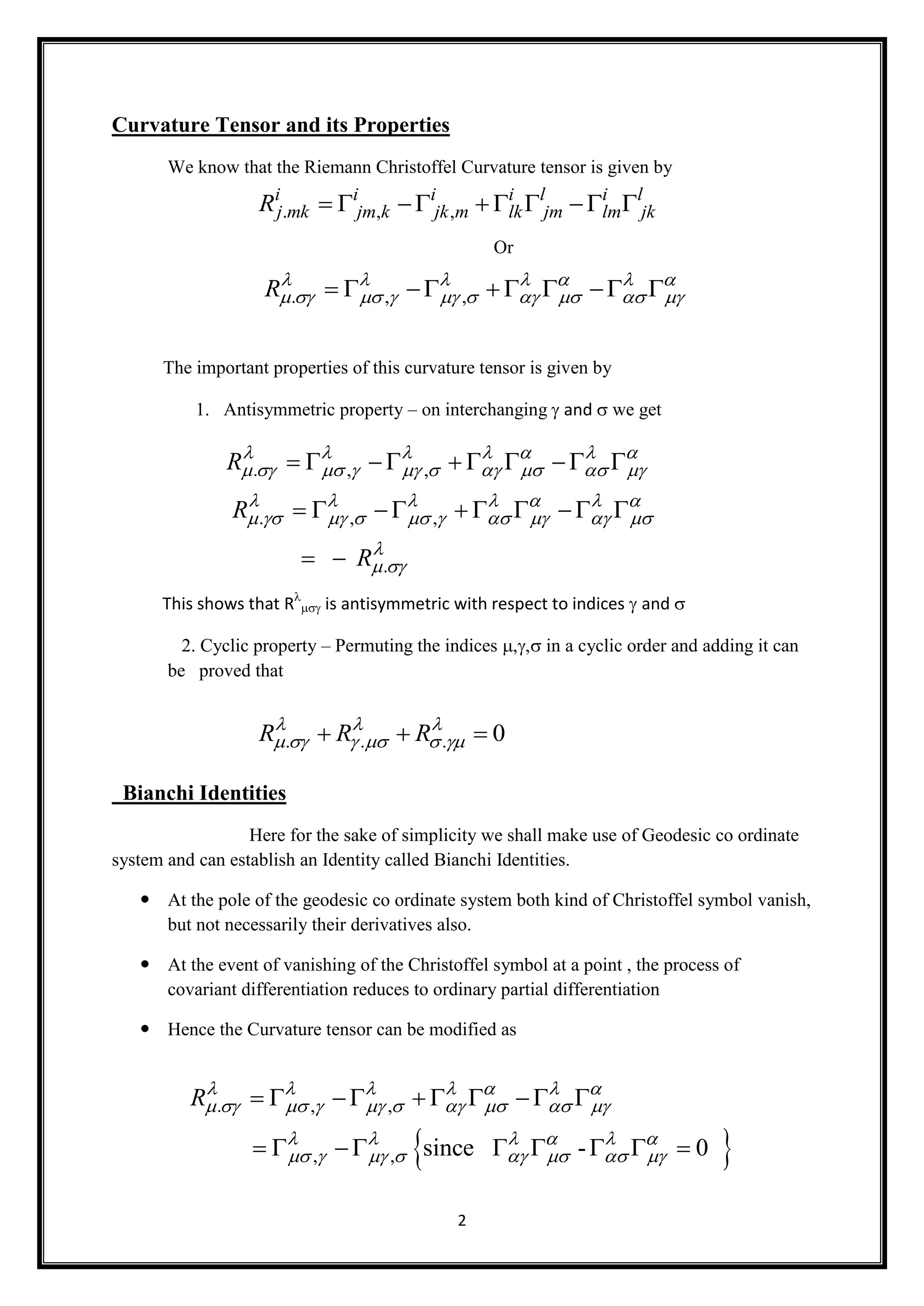 1. The document discusses tensor analysis and its use in studying the Einstein field equations. It defines key tensors such as the Riemann-Christoffel curvature tensor and its properties including the antisymmetric and cyclic properties.