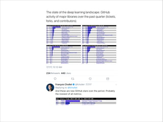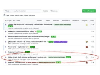 This document discusses using TensorFlow on Android. It begins by introducing TensorFlow and how it works as a dataflow graph. It then discusses efforts to optimize TensorFlow for mobile and embedded devices through techniques like quantization and models like MobileNet that use depthwise separable convolutions. It shares experiences building and running TensorFlow models on Android, including benchmarking an Inception model and building a label_image demo. It also compares TensorFlow mobile efforts to other mobile deep learning frameworks like CoreML and the upcoming Android Neural Networks API.