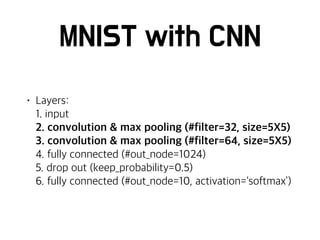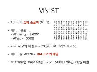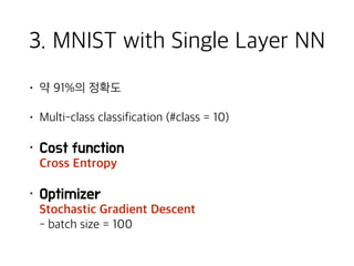 Source code: https://github.com/uosdmlab/tensorflow-tutorial 2016년 11월 14일에 서울시립대학교 대학원 수업에서 진행한 텐서플로 걸음마 슬라이드입니다. 한국에서 출판된 "텐서플로 첫걸음"이라는 책을 바탕으로 만들었습니다. TensorFlow에 대한 간략한 설명과 5가지 예제 코드를 다룹니다. 특히 그 중 MNIST 데이터셋을 CNN으로 분류하는 과정을 자세히 설명했습니다 ^^