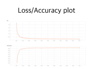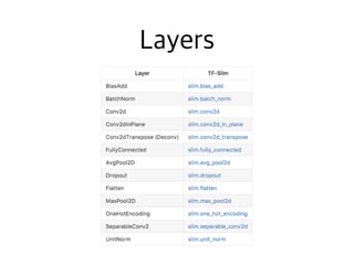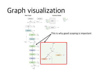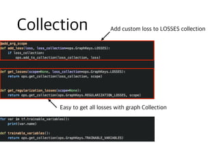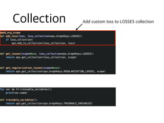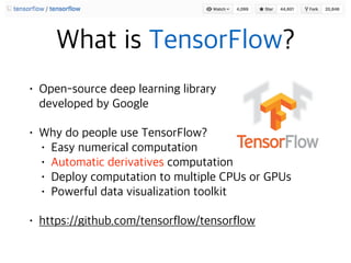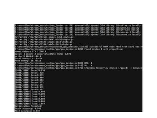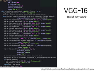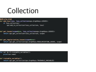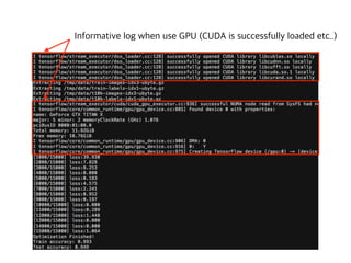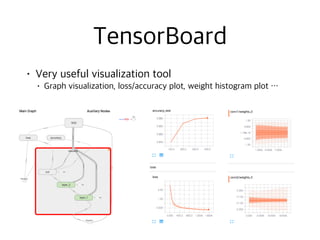 The document contains code snippets demonstrating the use of TensorFlow for building and training neural networks. It shows how to: