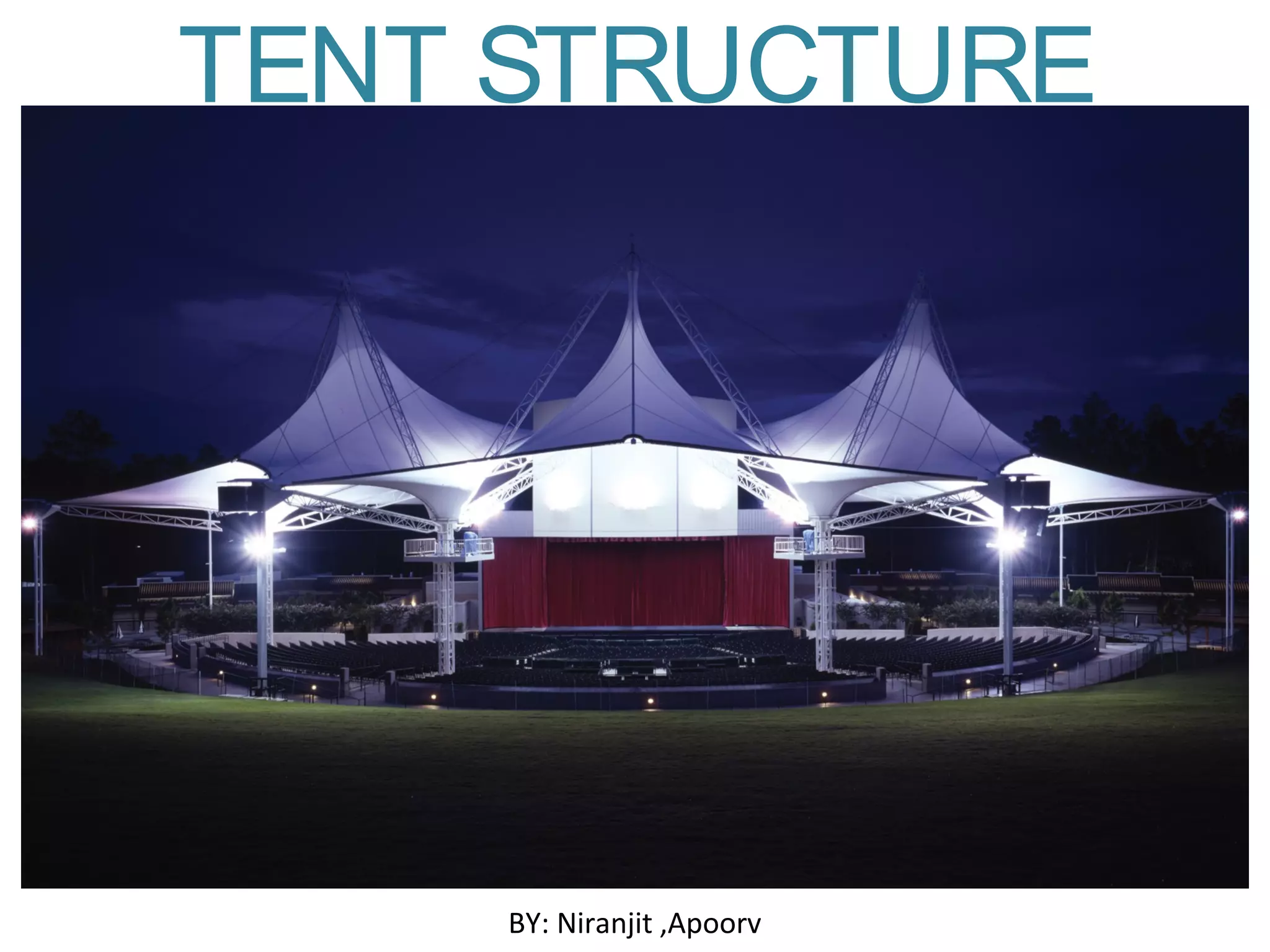 The document discusses tent structures, providing definitions and describing key components. It notes that tent structures have existed for nomadic peoples but are now used for camping and military purposes. The document outlines several common tent structure types including saddle roof, mast supported, and arc supported structures. It also describes common components like membranes, bale rings, and base plates. Both advantages like flexibility, reusability and environmental friendliness as well as disadvantages like lack of rigidity and thermal limitations are highlighted.