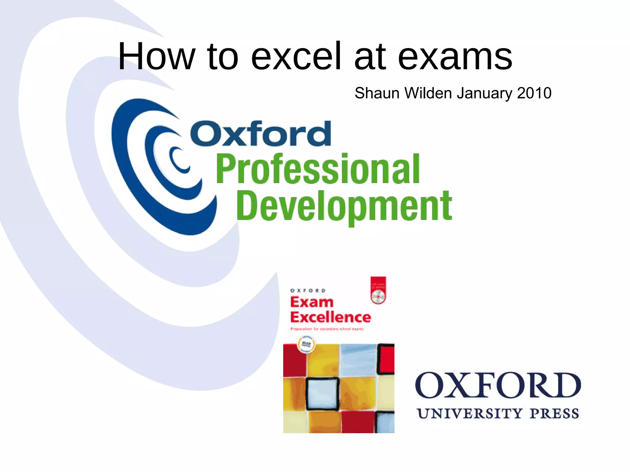 This document provides 10 tips for excelling at exams from the book "Exam Excellence" by Shaun Wilden. The tips include: paying attention to detail, reading instructions carefully, checking answers, using skimming, connecting sentences through cross-referencing, not worrying about unknown words, using different words with the same meaning, expressing opinions even if not your own, remembering "why" and "because", and that there are over 100 tips in the book for exam preparation and language learning.