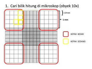 Dokumen tersebut memberikan instruksi lengkap untuk menghitung jumlah leukosit dalam darah dengan menggunakan pipet dan bilik hitung. Langkah-langkahnya meliputi pengenceran darah, pengisian pipet dan bilik hitung, serta cara menghitung jumlah leukosit dengan menggunakan rumus.