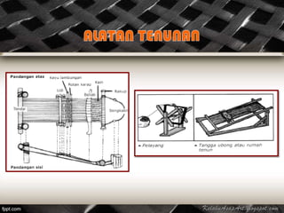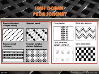 Songket is a traditional textile craft using silk and golden threads, originating from Terengganu, Pahang, and Kelantan on the east coast of Malaysia. It has a rich history, first worn by royalty and later recognized as an important symbol in various cultural ceremonies, particularly among the Iban community. The process of creating songket involves several intricate techniques that have been preserved through generations.