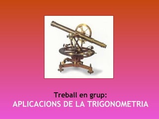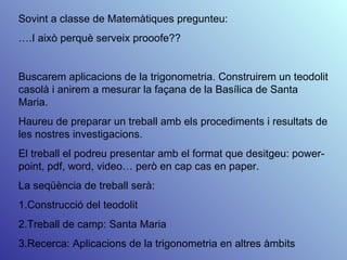 Sovint a classede Matemàtiques pregunteu: … .I això perquè serveix prooofe?? Buscarem aplicacions de la trigonometria. Construirem un teodolit casolà i anirem a mesurar la façana de la Basílica de Santa Maria. Haureu de preparar un treball amb els procediments i resultats de les nostres investigacions. El treball el podreu presentar amb el format que desitgeu: power-point, pdf, word, video… però en cap cas en paper. La seqüència de treball serà: 1.Construcció del teodolit 2.Treball de camp: Santa Maria 3.Recerca: Aplicacions de la trigonometria en altres àmbits