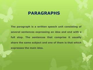 The document discusses different types of paragraphs used in writing. It identifies 18 types of paragraphs including argumentative, conceptual, chronological, enumeration, description, explanatory, presentation, persuasive, introductory, expository, problem-solution, sequence, transition, opening, narrative, descriptive, comparative, and cause-effect paragraphs. It also distinguishes between functional paragraphs that guide exposure of thought and informational paragraphs that support and develop the content of a text.