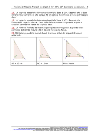 Il documento tratta del teorema di Pitagora applicato ai triangoli con angoli di 45°, 30° e 60°, fornendo una raccolta di problemi relativi a queste figure geometriche. Include esercizi con soluzioni per calcolare il perimetro e l'area di diverse tipologie di triangoli, tra cui quelli rettangoli e isosceli. Tutti i contenuti sono protetti da licenza Creative Commons e possono essere utilizzati solo per scopi non commerciali con attribuzione all'autore.