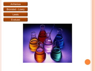 Dokumen ini membahas teori asam-basa menurut Arrhenius, Bronsted-Lowry, dan Lewis, termasuk definisi, ionisasi, serta contoh-contoh asam dan basa. Dikatakan bahwa asam dapat digolongkan menjadi asam monovalen, bivalen, dan trivalen berdasarkan jumlah ion H+ yang dihasilkan, sedangkan basa dibedakan menjadi basa kuat dan lemah berdasarkan derajat ionisasinya. Selain itu, terdapat penjelasan tentang pasangan asam-basa konyugat serta reaksi berdasarkan teori Lewis.