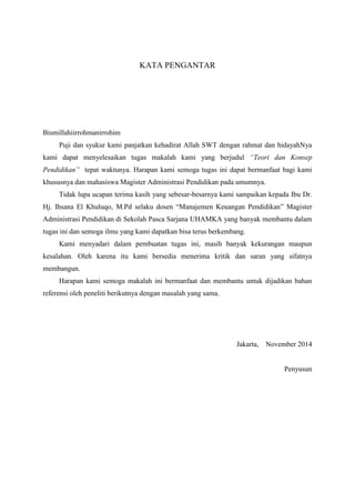 Teori dan konsep pendidikan yang dapat diterapkan di sebuah sekolah meliputi teori-teori pendidikan seperti teori perkembangan, teori pembelajaran, dan teori manajemen pendidikan. Konsep pendidikan yang relevan mencakup proses pendidikan, komponen-komponen pendidikan, dan peranan pendidikan dalam masyarakat.