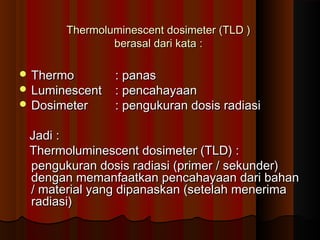 Dokumen tersebut membahas tentang teori dasar dari thermoluminescent dosimeter (TLD) yang merupakan alat pengukur dosis radiasi dengan memanfaatkan pencahayaan yang dihasilkan dari bahan yang dipanaskan setelah menerima radiasi. TLD memiliki berbagai keunggulan seperti rentang energi yang lebar, tidak dipengaruhi laju dosis, dan fleksibel untuk pengukuran ekstremitas. TLD banyak digunakan dalam bidang kese