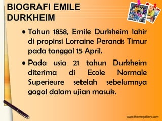 Emile Durkheim, lahir pada tahun 1858, adalah pendiri sosiologi sebagai disiplin ilmu dan dikenal melalui teorinya tentang solidaritas sosial, fakta sosial, bunuh diri, dan agama. Ia membedakan solidaritas menjadi mekanik dan organik sesuai dengan struktur masyarakat, serta mengidentifikasi anomi sebagai dampak dari perubahan sosial yang cepat. Karyanya berfokus pada hubungan antara tindakan individu dan struktur sosial serta bagaimana fenomena sosial dapat menjadi objek studi sosiologis.